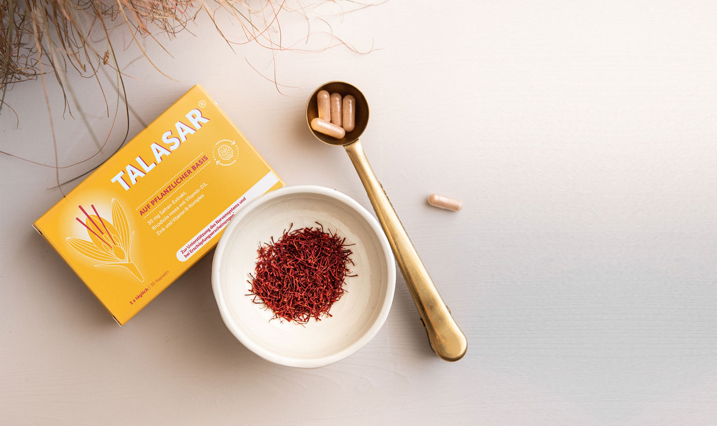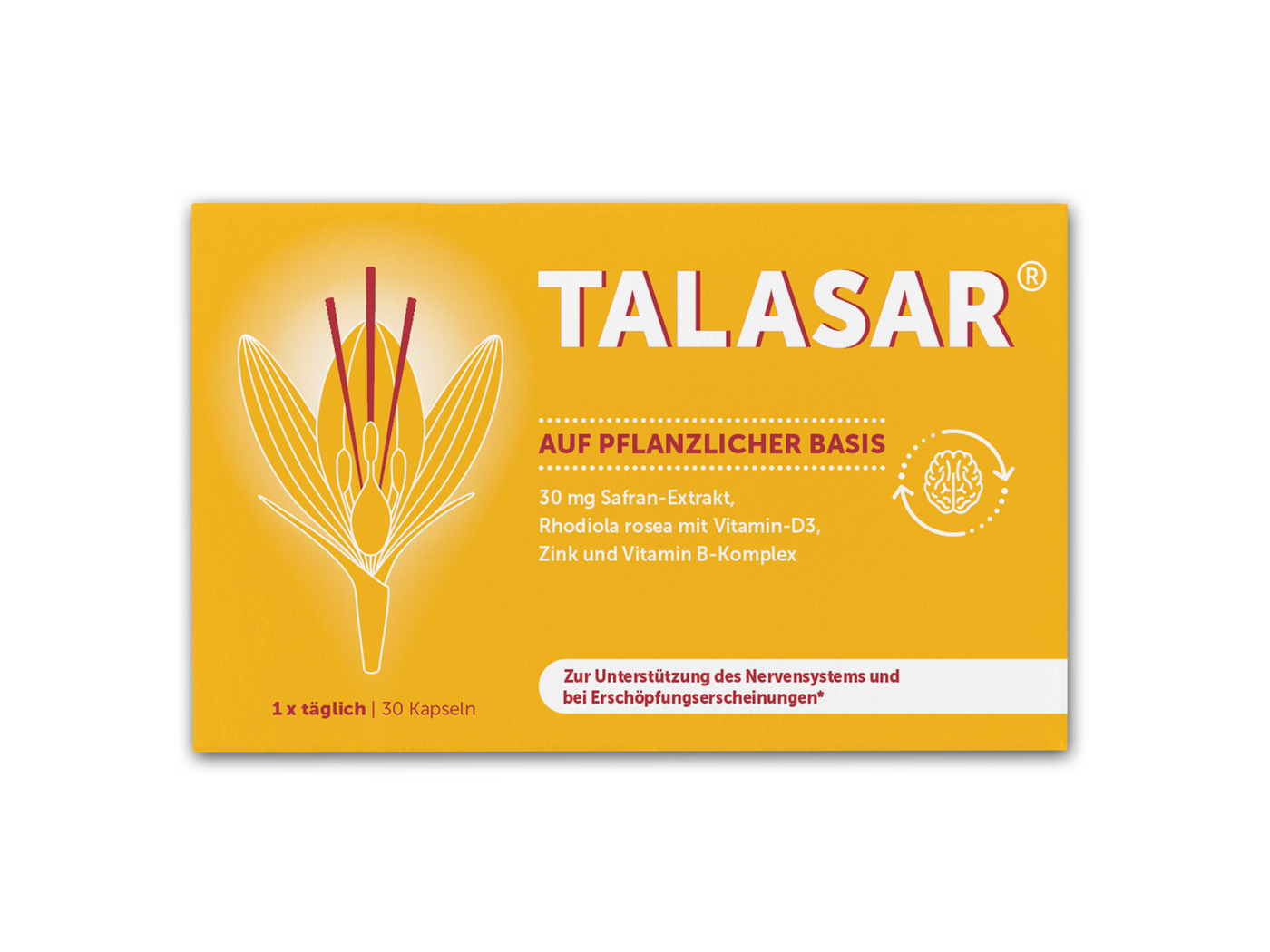 Die einzigartige Rezeptur vereint den hochwertigen Safran-Extrakt mit Vitaminen und Mineralstoffen. TALASAR® unterstützt Nerven, geistige Leistung und das emotionale Gleichgewicht.*