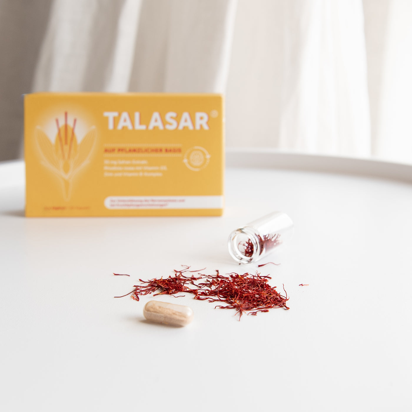 TALASAR®, mit echtem Safran-Extrakt, einem Vitamin B-Komplex, Zink und Vitamin D3 kann dich dabei unterstützen, das seelische Gleichgewicht zu erhalten.
