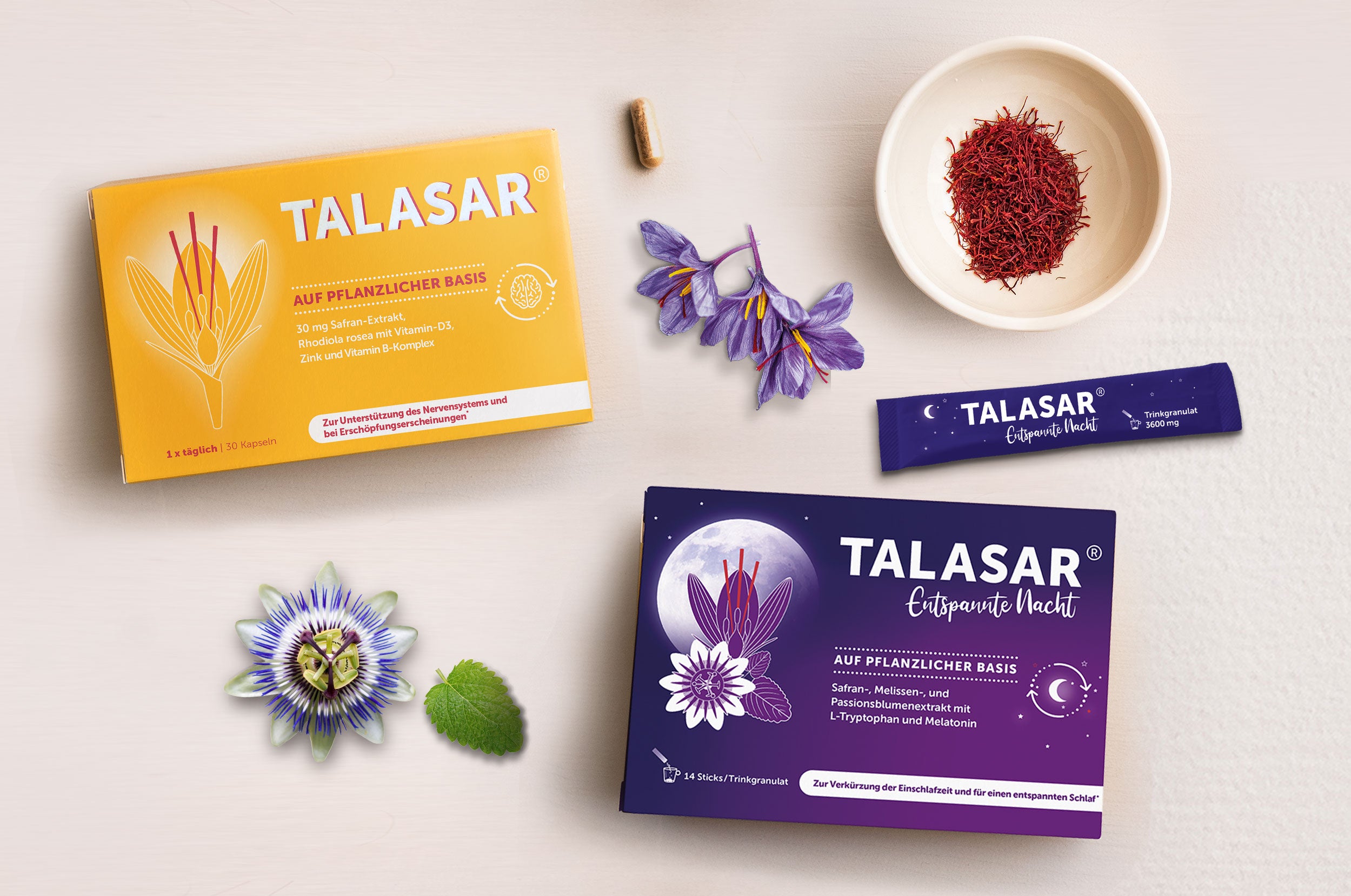 TALASAR® ist eine einzigartige Nährstoff-Kombination mit dem Hauptinhaltsstoff Safran aus der Crocus sativus-Pflanze, ergänzt durch Rhodiola rosea-Extrakt sowie Vitamine und Mineralstoffe. Es unterstützt bei mentaler Erschöpfung und Antriebslosigkeit. Mit TALASAR® kam das erste safranbasierte Präparat in Deutschlands Apotheken.
